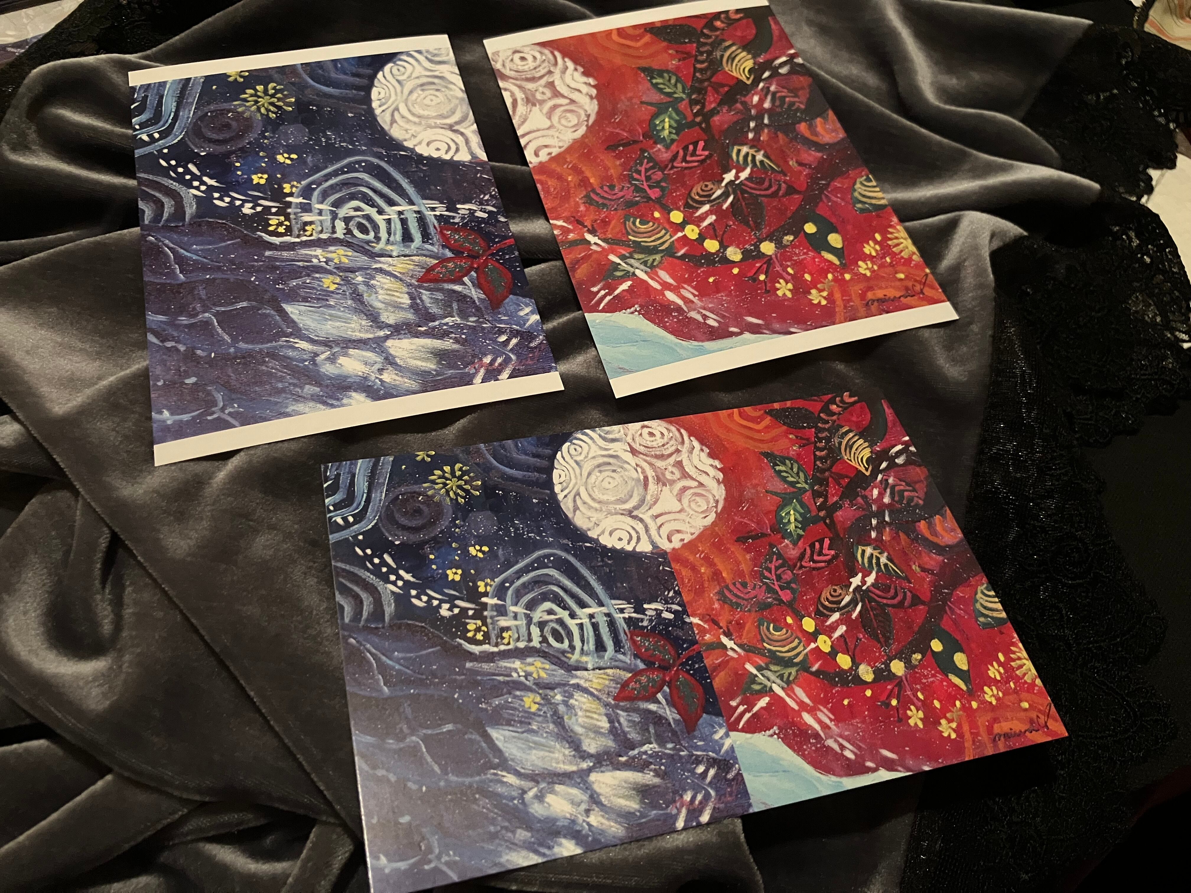 劇中に登場した、舞台モチーフのアクリル絵画デザインのポストカード3枚